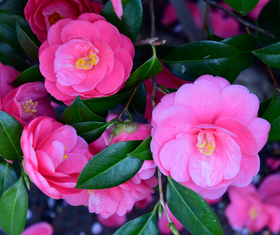 As the sasanquas begin to fade, the Camellia japonicas take center stage, providing a much-needed splash of color in late winter and early spring.