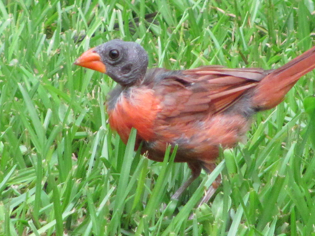 begging next to feeders; if you see a gray-beaked Cardinal flapping its wings frantically on the ground and emitting a high-pitched Eeeeeeeeeep sound, you can be sure Mom and Dad