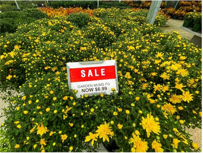 If you’re looking for something low to the ground, takes full sun, and gives a balance of color and greenery, I would suggest the Garden Mum. We have it in stock in a few different colors (yellow left, pink right). They’re a great, hardy plant and I always like to keep them in mind, especially since they marked down right now.