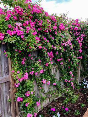 Vibrant pink blooms burst forth in the spring, a beautiful contrast to the backdrop of glossy green foliage. This vigorous rose can easily reach heights of 15 feet or more, perfect for adorning fences, walls, or trellises. While it does have long, arching stems, I wouldn’t worry too much about pesky thorns. Peggy Martins are considered semi-thornless, making management much easier than other roses.