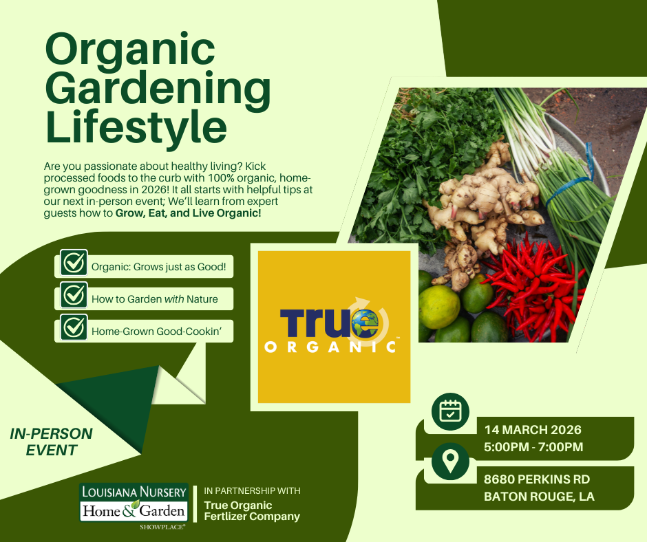 Are you passionate about healthy living? Kick processed foods to the curb with 100% organic, home-grown goodness in 2026! It all starts with helpful tips at our next in-person event; We’ll learn from expert guests how to Grow, Eat, and Live Organic! When: 5:00pm - 7:00pm, March 14th, 2026 Where: 8680 Perkins Rd, Baton Rouge (Louisiana Nursery) […]