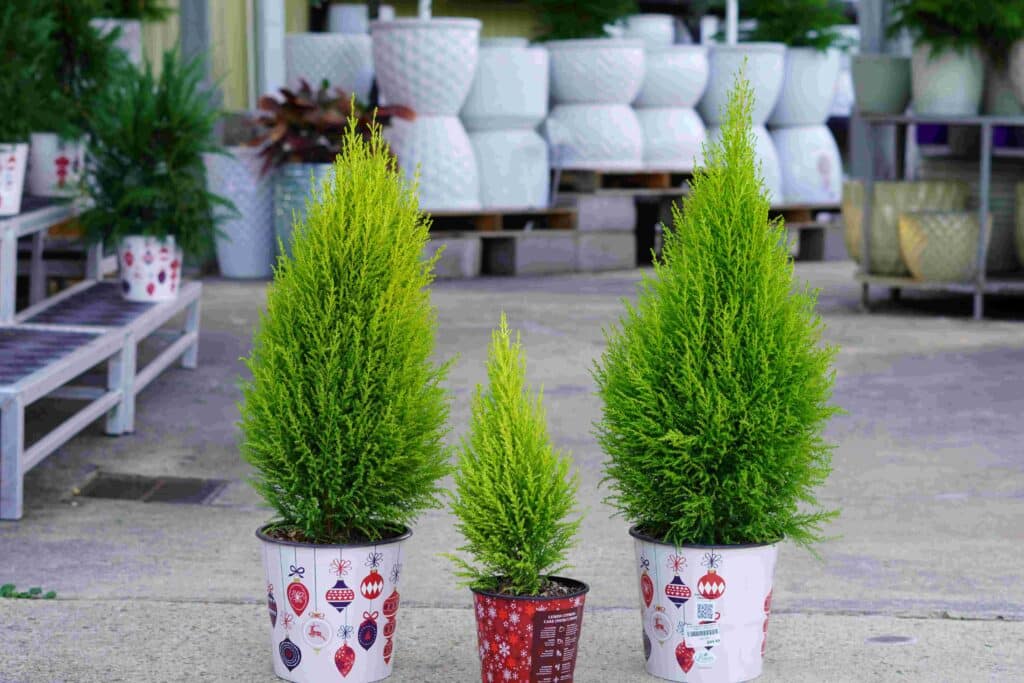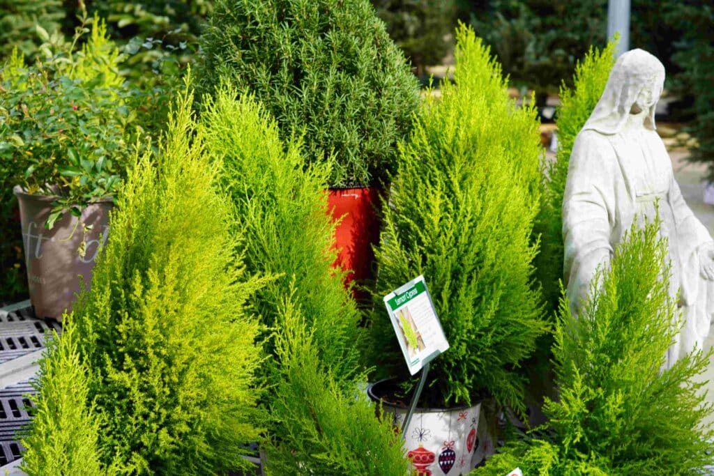 Lemon Cypress is characterized by its bright green, needle-like foliage and a lemony scent. These small trees are often shaped into perfect conical forms for the holiday season.